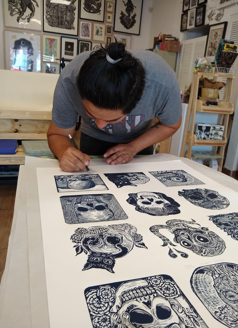 The celebration of the Day of the Dead in Oaxaca is one of the main festivals due to tradition, legacy of worship and respect for death since pre-Hispanic times, as part of the projects of our workshop, during the month of October we worked on the realization of two collective tzompatlis from the traditional graphics, with the participation of 24 Oaxacan artists with the elaboration of a skull with the particularity of the work style of each one, this to elaborate with them together two prints of 12 pieces each and with a limited edition.